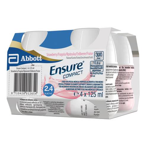 EnsureCOMPACT Prodotto indicato per le persone a rischio o già in fase di malnutrizione con problemi di restrizione di liquidi o che hanno difficoltà a consumare interamente le quantità raccomandate (deficit nutrizionali, problemi di masticazione, disturbi apparato digerente, fibrosi cistica, insufficienza cardiaca congestizia). Gusti disponibili: vaniglia, banana, fragola. Ingredienti Analisi media Per 100 g Grassi di cui saturi 9,35 g 0,8 g Carboidrati di cui zuccheri 28,77 g 6,2 g Proteine 10,2 g Sale 0,36 g Acqua 64,3 g Colina 97 mg Vitamina A 155 mcg Vitamina D3 3,0 mcg Vitamina E 4,7 mg Vitamina K1 21 mcg ...