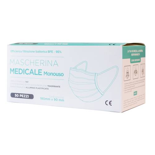 MASCHERINA MEDICALE MONOUSODescrizione Dispositivo medico di classe I - tipo I. CE standard UNI EN 14683:2019+AC:2019. Mascherina monouso, in triplo strato di TNT, per evitare contaminazioni e proteggere le vie respiratorie da polveri, spray e altri materiali similari. Efficienza di filtrazione batterica (BFE) >95%. Banda nasale in alluminio plastificato. Latex free. Componenti Tre strati 100% polipropilene. - Strato esterno: TNT; - Strato interno: polipropilene meltblown. Modalità d'uso Applicare la maschera al viso con elastici, evitando il contatto con parti contaminate. Avvertenze Monouso: non riutiliz...